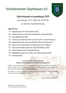 Jahreshauptversammlung Schützenverein This event has ended Datum 10. Januar 2026 Zeit 20:00 Gaststätte Klocke Trift 2, 33039 Nieheim